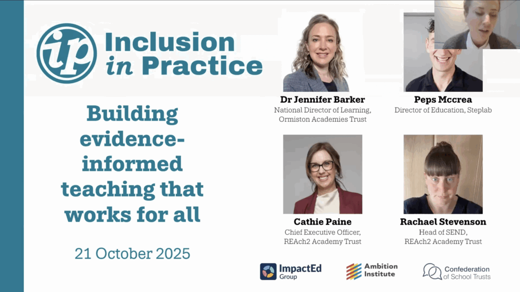 This is an Ambition Institute recording of the recent webinar: Inclusion in Practice: Building evidence-informed teaching that works for all. The event took place on Tuesday 21 October 2025. In the first instalment of a three-part webinar series, our panellists brought to life key insights from Inclusion in Practice’s work, focusing on inclusive and adaptive […]