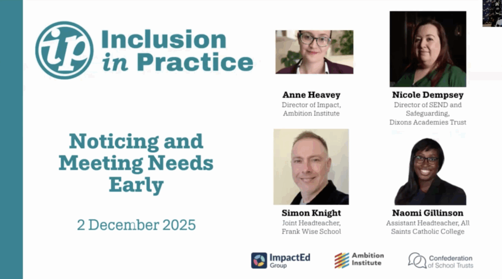 This is an Ambition Institute recording of the recent webinar: Inclusion in Practice: Noticing and Meeting Needs Early. The event took place on Tuesday 2nd December 2025.